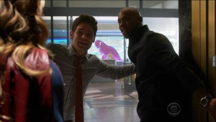 CatCo is also where Supergirl gets its weekly dose of love triangle subplot goodness. Winn Schott (vague hints at his backstory suggest he might be the son of the similarly named Superman villain Toyman) is Adorable Best Friend Who Loves Her For Her. As anyone who has ever seen a movie knows, ABFWLHFH has to be countered by HUOWMHHGB aka Hunky Unavailable Outsider Who Makes Her Heart Go Boom (#MadAcronymSkills). In this case, the HUOWMHHGB is Jimmy Olsen, whom I’m pretty sure is more unassuming than hunky in most Superman properties but here is going by “James” and is all kinds of dreamy. If you’d told me before I saw the pilot that Jeremy Jordan (of all people) was going to be the boy next door who gets overshadowed by a sexier option, I would have called you crazy but it turns out that Jordan is pretty adept at turning down that effortless charisma and turning up the adorkability as the office tech nerd whose crush doesn’t notice him. It helps that he’s standing next to the tall, broad shouldered, deep voiced piece of perfect that is Mehcad Brooks as James (it also helps that he’s not singing; a lot of the magic is in the singing). James’ perfection is actually so overwhelming it’s a little unconvincing. Winn, though thoroughly wonderful, is a little bit petty, a lot jealous, sometimes the tiniest bit cowardly; he has family secrets he’s trying to hide and deep wounds he’s trying to hide from. It’s not that Jordan has gotten all that much more screentime than Brooks (he might even have had less thus far) but the writers are clearly going somewhere with him and Jordan has plenty to play beyond unrequited love. My fear with James Olsen is that being arguably the most mainstream character stolen from the Superman story might hold him back from developing into a full, new character in this specific Supergirl universe. Brooks has incredible screen presence and his chemistry with Benoist absolutely simmers but I’m not yet convinced there’s much going on with him beyond fundamental good guy-ness in an irresistible package. But that’s a season two problem; maybe even season three. For now, James Olsen in his simple, dreamy decency is pretty good TV.