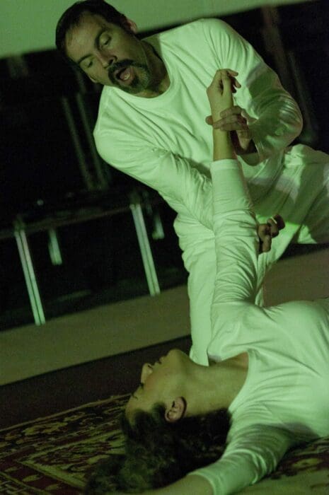 The production as a whole gives the capable ensemble a fun and challenging world to play in. Clad in the counter-expectation white, each cast member has only a multi-purpose scarf to distinguish each of their characters. It’s a visually effective choice that fits well with the general artistic vision of the piece. The negative consequence of the device is the necessity of broader character interpretations to help distinguish them from each other. Cloten’s flamboyant childishness and the over-the-top caveman overtones of the lost sons (Guiderius and Arviragas) might not have to be as broad in a production with more visual indicators.