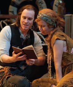 Designer Ken MacDonald’s set is both gorgeous and fascinating with lots of dimension and detail for the eye to discover throughout the play’s 2 hours and 20 minutes. The addition of a scrim downstage allows for some brilliant moments such as the interactive sketch of the play’s first setting that’s generated mid-scene and superimposed into the action.