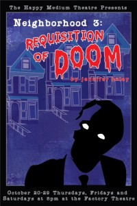 Happy Medium Theatre’s production of Neighborhood 3: Requisition of Doom by Jennifer Haley is often funny, endearing in a nerdy (and sometimes intensely angsty teenage way), and engrossing. The basic story is that in the creepy/Stepfordian suburb of an unnamed town, all the teenagers have become totally engrossed with a videogame that uses satellite photos of the players’ neighborhood and zombifies its inhabitants. But the game isn’t just a game, and the consequences of in-game action start appearing in the real world—so what happens at the final level? It’s an enjoyable night of theatre, especially if you like the scary side of Halloween and/or gaming.