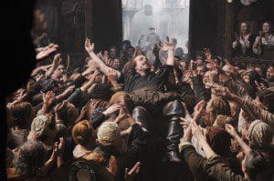 Like I said, most of that stuff didn’t actually bother us. (Though the assertion that Ben Jonson didn’t have a clear authorial voice of his own did almost get my friend Borah out of her seat and swinging at the screen). It mostly just made us laugh. But the thing is, Anonymous isn’t a comedy. It takes itself monumentally seriously. If it were an action-adventure caper with the sort of rip-roaring purposeful anachronism that marked the recent remake of The Three Musketeers, for instance, it might have even been a success (had, you know, the writing and direction been better, and all that). The academic seriousness with which major Shakespearean name Derek Jacobi presents Anonymous‘ argument, however, makes that in-the-moment joy of mockery the film inspires hard to sustain when viewing the picture as a whole.
