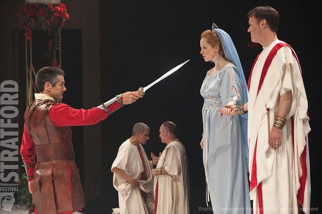 I think that moment of revenge was always extremely satisfying. And the reveal of these large knives was always a satisfying conclusion to a horrible journey. And it’s interesting to get the audience feedback whether it’s horror, or sometimes a round of applause, or laughter, or shock—that was always kind of the rewarding part of the horrible story. Not that I’m condoning revenge violence, but I guess I’m just saying that in a theatrical way it’s exciting. And I really just loved working with the cast. You know, Skye Brandon played my husband [Bassianus], and he’s just a joy to work with, and John Vickery [who played Titus] and I have done every play together—that I’ve done at Stratford—he’s been in the cast and he really became kind of a second father to me, so it’s really a pleasure.