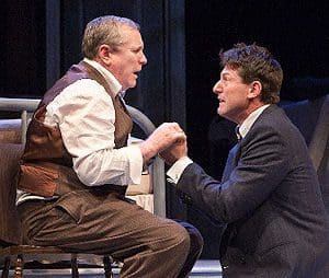 Nancy Palk is radiant as Willie’s long-suffering and endlessly supportive wife Linda and her chemistry with Ziegler is wonderfully casual, an ease only a long-married couple can achieve while trying to establish the rhythms of a long-married couple. My one criticism (and you know how rarely I criticize Nancy Palk) would be that her relationship with the sons who are so protective of her isn’t as intricately developed as her work in Long Day’s Journey Into Night earlier this season. That might be a product of this being a remount from two years ago- it had a shorter rehearsal time this season than most Soulpepper productions and Mike Ross was just joining the cast as a Happy replacement. I really like Ross and his Happy is goofy and sad- a perfect combination for the overlooked character- but I’m starting to feel like he’s repetitive. He consistently gets at the emotional journey of his characters, but the charismatic actor himself (whom audiences know, out of character, from the Young Centre Word and Cabaret festivals) never fully disappears.