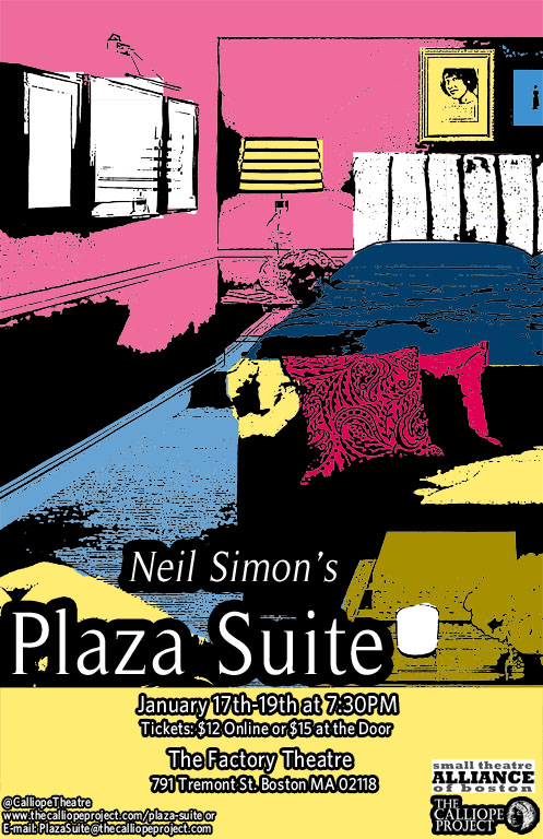 Plaza Suite goes up in The Factory Theater at 791 Tremont St. Boston MA at 7:30 pm January 17-19. The show runs approximately two hours and has a ten minute intermission. Tickets are $15 at the door or $12 online and can be purchased at thecalliopeproject.com/plaza-suite.