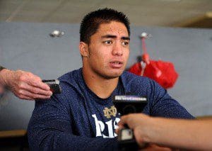 Notre Dame linebacker Manti Te’o answers a question during NCAA college football media day, Thursday, Aug. 16, 2012 in South Bend, Ind. (AP Photo/Joe Raymond)
