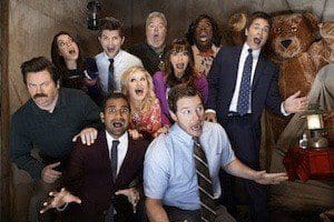 PARKS AND RECREATION — Season: 5 — Pictured: (l-r) Nick Offerman as Ron Swanson, Aubrey Plaza as April Ludgate, Aziz Ansari as Tom Haverford, Adam Scott as Ben Wyatt, Amy Poehler as Leslie Knope, Jim O’Heir as Jerry Gergich, Rashida Jones as Ann Perkins, Chris Pratt as Andy Dwyer, Retta as Donna Meagle, Rob Lowe as Chris Traeger — (Photo by: Chris Haston/NBC)