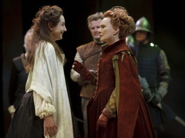 DIRECTINPUT~ This image has been directly inputted by the user. The photo desk has not viewed this image or cleared rights to the image. Lucy Peacock (left) as Mary Stuart and Seana McKenna as Elizabeth with members of the company in Mary Stuart. Photo by David Hou. Mary Stuart Stratford