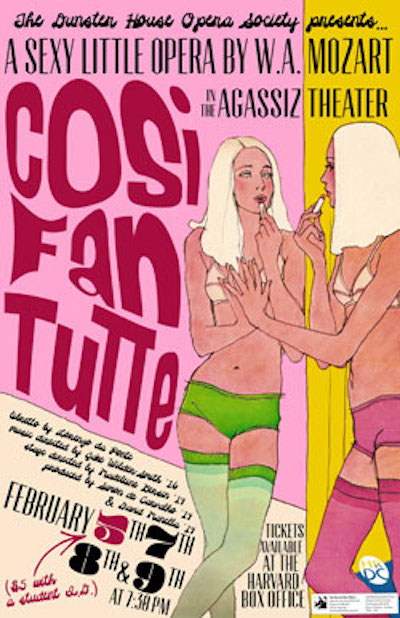 All of this is a long preamble to my impression of Cosi Fan Tutte by the Dunsten House Opera Society at Harvard University. This is undoubtedly at the student theater level, and while that comes with a certain “scaling back” on your expectations of productions values, the overwhelming youthful energy bursting out embraces the ridiculous, pokes fun at its own limitations, and drags you along for the ride. This was the first opera I’d seen by people my own age or younger. The most obvious push toward accessing their young demographic was the translation. I was happy to see that the opera was to be performed in English since the beautiful Aggasiz Theater did not appear to have a subtitle bar, but I was not expecting such a modern translation. The talk ranged from casual banter to grand poetics with the occasional obscenity thrown in for flavor. There’s a certain whimsy to be had hearing characters sing so beautifully in such modern language. The grand sound of opera seems sincere when singing the poetics of foreign language, while the absurdity cannot be unheard with phrases like: “It’s your girlfriend, she’s pissed.”