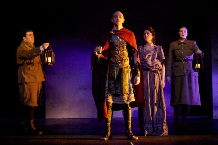 The Male Chorus (Salvatore Atti) and Female Chorus (Katie Abraham) frame the piece with their omnipresent dialogue and soliloquies on the opera’s action. Atti and Abraham had good voices, but without a clear frame of reference for them, their roles come across as mere plot devices. Stage Director Nathan Troup is thoughtful and knowledgeable, but I wouldn’t call this work accessible. He frames the opera with two World War II British officers surveying the remains of the ravaged landscape, presumably after the rebellion which occurs after the opera ends. But my question is why? Why do we care? It’s quite stagnant and even disastrous to have the two narrators so focused on “reconcil[ing] within themselves those things they cannot go back and change.” This decision denies these characters the opportunity to form meaningful relationships and connections with other people because they are so distraught and focused on reconciling their inner struggles.