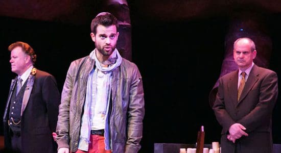 David Ives’ intellectually intriguing but potentially dry play New Jerusalem rests squarely on the shoulders of the man it puts on trial- charismatic and controversial philosopher Baruch de Spinoza. Director Mitchell Cushman’s smart (if confusingly anachronistic) modernization helped give the piece a sense of relevance and urgency. Nick Blais’ gorgeous set melded industrial and devotional elements with a dash of practical stage magic for the play’s memorable final moment. Alon Nashman summoned immense authority and heartbreaking sympathy as the rabbi tasked with denouncing his beloved pupil. But it was Aris Athanasopoulos who had to make the audience admire and care for him enough to sell the emotional stakes of the entire piece. We needed to believe his thoughts and his words had the power to rock an entire community and make a good man threatening. We had to understand how so many people could both love him and condemn him. Athanasopoulos achieved all that and more. Accoutred as a modern-day against-the-grain dreamboat with too much time on his hands and too many thoughts in his head, Athanasopoulos wandered into the lobby where the play began as though he were just another bystander and immediately commanded attention. His excellent early scenes contemplating art and philosophizing on the price of fish with his best friend Simon (played charmingly with an excellent moral centre by James Graham) established Baruch as a worthy intellect and charismatic community member while his subsequent encounter with his grating love interest Clara (Amy Keating- a rare cast member I didn’t love) proved him an honorable man worthy of better than he would later receive. With the audience easily won to his side in the first twenty minutes, Athanasopoulos stood tall for the remainder of the play as attack after attack was launched his way by a series of officials (highlighted by Michael Hanrahan, lowlighted by the slightly awkward David Eisner), his own sister (Sascha Cole- at times a bit much but in possession of some much-needed wit), and eventually his own rabbi. The text gets a little lost in its own intellectualism mid-act two but this production always stayed on course, following its leading man.