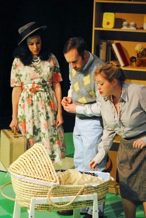 Underneath the craziness, the humanity of fearing whether our mistakes as parents will inform and transform their children’s lives into something less than ideal. How much of our lives and who we are is dictated by the choices made by those who raise us? Happy Medium’s season boasts a theme of “Home is where the horror is,” and this play is a delightful thrill-fest. Though the humor may not be everyone’s cup of (chamomile) tea, the production stirs up laughter to keep you smiling through the darkness. Only after leaving the theater do you realize that you just laughed about mothers smothering newborns, babies who pretend to be baked potatoes, and adulterous husbands and fathers. While Meagan Becker’s costume design is flattering and sets the time period and mood with charming efficiency, it’s the scenic designer by co-designers Morris and Deirdre Benson that steals the show. Easily the most useful and resourceful accents to the drab Factory Theatre’s space, Morris and Benson’s off-kilter and angular set design perfectly accent the play’s humor. Benson also deserves a strong nod for her clever sound design, which is evocative of the time period while offering a timeless humor and poignancy to it all.