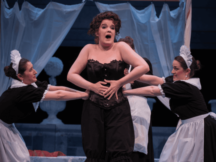 Stage director Joshua Major handles the comedy with a light touch, which is ideal for this piece. Staging is very simple and characters are often in almost a straight line, but the work doesn’t call for anything more complex and the subtle nuances in the blocking feel natural. The humor comes from the dramatic scenarios, not from any hamming of gimmicky gesticulations that are so common in comic opera production. With a bright, colorful set by Stephen Dobay and a lively chorus set against the nuanced performances of the leading singers, the production is festive and funny but never overwhelming.