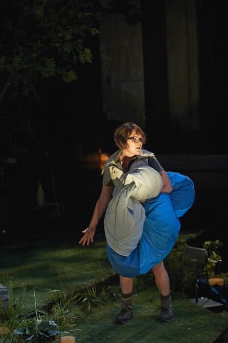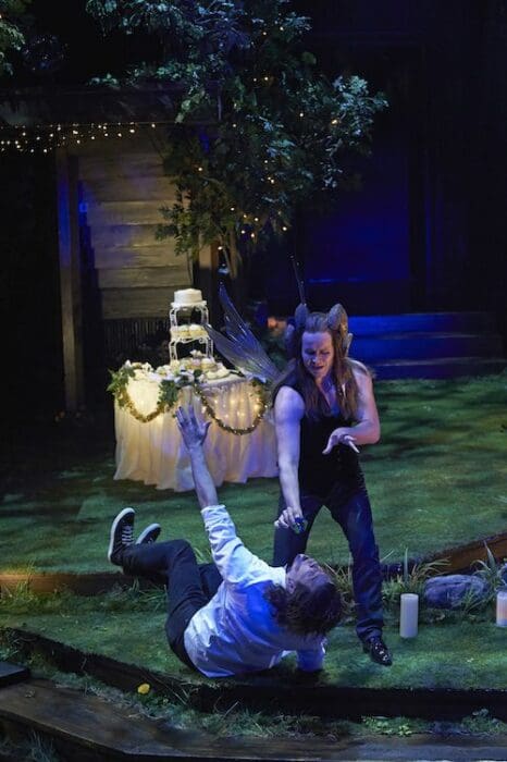 With the theme of performance already in the text, Abraham adds another layer and turns the Festival Theatre into a backyard wedding reception where friends of a pair of adorable newlyweds (Josue Laboucane and Thomas Olajide) are preparing to put on A Midsummer Night’s Dream as a surprise wedding gift. It’s not a particularly original frame but the cast is so winning that it adds a lot to the production, starting with a touching opening wherein the ensemble sings “The Book of Love” and allowing the actors to play around with the fourth wall and show a bit of their own personalities and relationships (this was best illustrated by the great and hilarious Jonathan Goad at Sunday’s performance as he playfully broke character to torture Mike Shara whose Demetrius was frozen in an uncomfortable position; “how’re your abs doing?” he inquired, forcing a laugh from Shara and earning a roar from the audience). The frame also makes room for standout actors to make forgettable characters into highlights of the production, a phenomenon best represented by Maev Beaty who steals plenty of scenes in the unlikely form of Hippolyta (matched perfectly by the unassailably charming Scott Wentworth as Theseus).