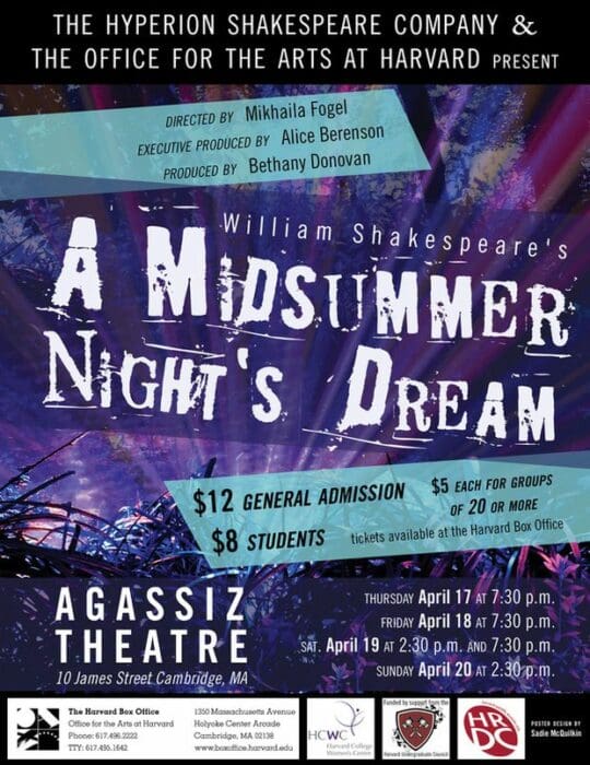 Shakespeare’s A Midsummer Night’s Dream is a wonderfully accessible play, made for adaptations to different times and places with ease. The Hyperion Shakespeare Company and The Office for the Arts at Harvard presented their own adaptation of William Shakespeare’s A Midsummer Night’s Dream with some talent and some reckless abandon befitting the play’s mastery. The production struggles, however, under some awkward adaptation, stilted performances, and uninspired concepts.