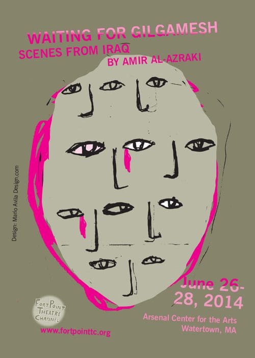 The audience enters the Arsenal Center Black Box, and is instantly greeted with music. Faraz Firoozabadi (percussion), Stephen J. Lamb (guitar), and Jacques Pardo (composer and sound designer), set the mood as we prepare to enter Iraq, the real and reimagined space offered by Amir Al-Azraki in Waiting for Gilgamesh: Scenes from Iraq, directed by Marc S. Miller. Green and blue painted mosaics decorated the black box floor, and a large sculpted face hung menacingly between thin “trees” to the right of a platform backed by a honeycomb-like wall (set design by Anne Loyer). I was very excited to see this show, presented by Fort Point Theatre Channel, the Joiner Institute for the Study of War and Social Consequences, and the Odysseus Project, and cosponsored by the Center for Arabic Culture. I was eager to discover how it would examine the conflicts that formed contemporary Iraq, specifically the legacy of the Iran-Iraq war (ending in1988), and both the lead-up and aftermath of the American invasion of 2003. Unfortunately, this production did not effectively fulfill its admirable ambitions.