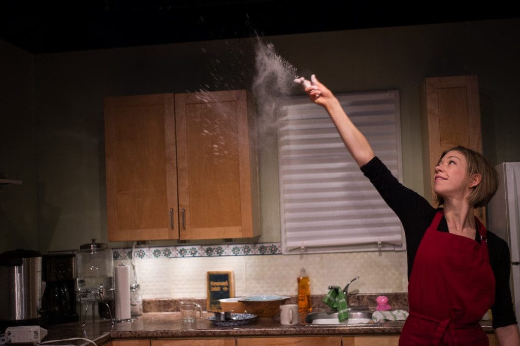 There was one big change that I have Melee to thank for. In the original piece I offered the audience coffee or tea, but I didn’t really intend to give anyone coffee or tea. In a show where I’m really there with people and really making a pie, it stuck out. Melee said that if you’re going to offer, you really have to do it. So all of a sudden I went from being up on stage, separate from my audience/guests, to really welcoming them, really serving coffee and tea, really being with each and every person that came in that door, as much as I could. The vulnerability and authenticity that required, without the traditional safe separation of me on stage, making an entrance once the house lights went down, was a challenge. That day in rehearsal when we really identified what the opening of the show was, I laid flat out on the floor, just taking a moment to take in what that meant, what I found so challenging about it, and the fact that I always seem to create the thing that’s hardest for me to do, just so I have an opportunity to dig in and do it. And also that I create my own necessary challenges long before I’ve even been able to identify them. I had to laugh at myself. Melee’s direction brought the show to a whole new level of love and connection for me, and I think for many people who saw it as well.