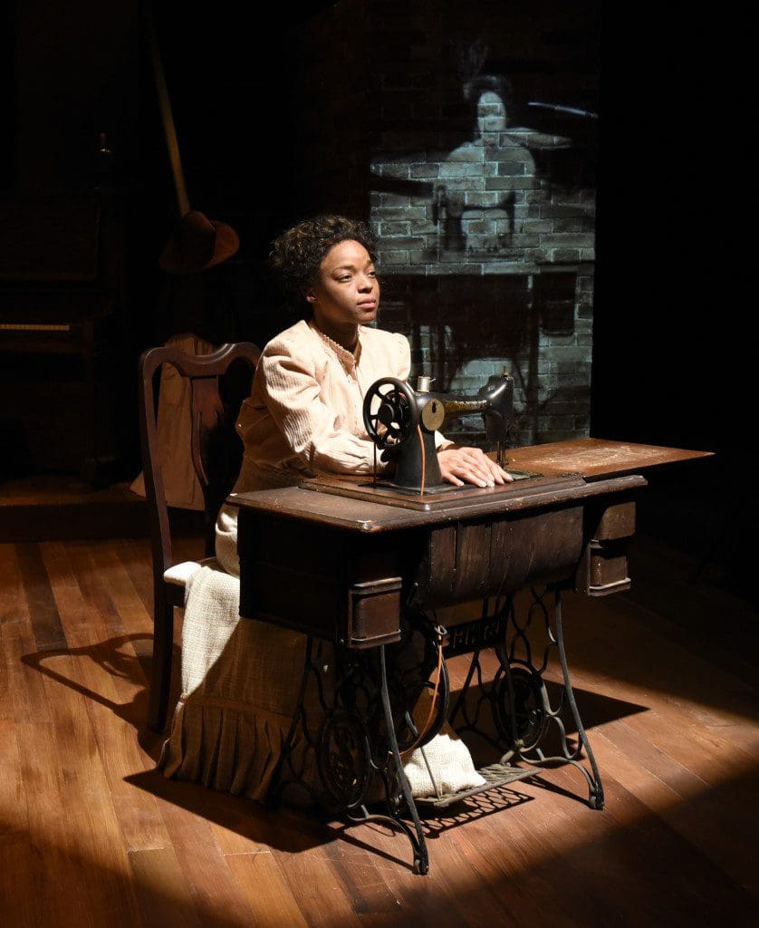 Watching Lyric Stage Company’s production of Intimate Apparel, directed by Summer L. Williams, I came to an unexpected conclusion: in this production, the important period piece finds its strongest stride in the individual and intensely personal more than in its historicity. There is so much to enjoy here: set in 1905, the play follows Esther Mills (Lindsey McWhorter), a black seamstress who spends her “spinster” days (she’s 35) sewing intimate apparel for wealthy white patrons and black ladies-of-the-night-alike. All who know her appreciate her warmth, kindness, and skill: the most appreciative of her friends is a Hasidic shopkeeper, Mr. Marks (Nael Nacer), who recognizes a kindred spirit in their mutual admiration of beautiful, painstakingly handcrafted fabrics. Everything changes when Esther strikes up a correspondence with a Barbadian laborer in Panama, a Mr. George Armstrong (Brandon G. Green); the promise of romance, marriage, and a new life with a husband threatens the life Esther has labored so hard and so long to stitch together and improve.