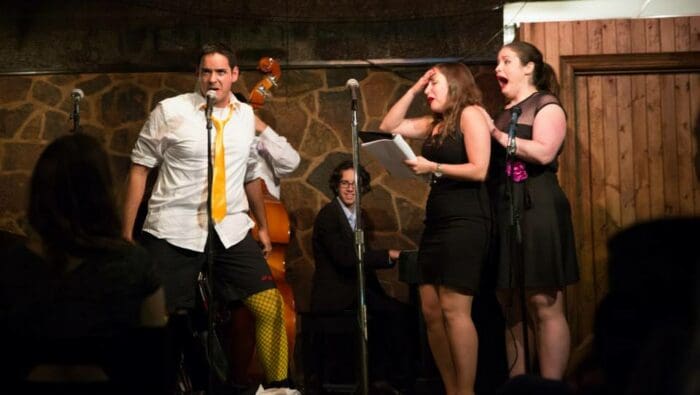 A few of the song selections in their version of Twelfth Night feel a little bit random (Sir Andrew’s “love song” is sincere and beautifully sung by Matthew Villemaire, which makes very little sense for the character) but some are perfect (Yipchuck’s uproarious “Orange Colored Sky” as a cross-gartered Malvolio). Bernardi as Olivia is the lone cast member to deliver both impressive vocals (at an intelligible decibel level) and a version of her Twelfth Night character that stands on its own outside of the new jazz context but the whole crew at this two-nights-only production brought infectious energy to the annoyingly loud Imperial Pub back room.