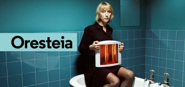 What Oresteia does best is its atmosphere: the bareness of the stage and the framing of Orestes’ cross-examination—in between the bloody action of the play—means that the audience never feels comfortable. Despite Agamemnon’s family life being treated with sweetness and commensality, the lighting (thanks to Natasha Chivers), along with the staging, is cold. This coldness is further embodied in the aforementioned clock which also record the times of the characters’ deaths. The table at which Agamemnon (Angus Wright) and his family sit could well be used for surgery. The house that the king and Klytemnestra (Lia Williams) live in is as dead as they will be.