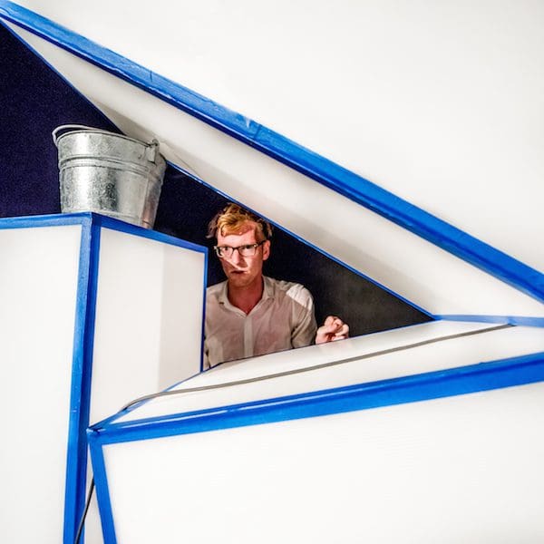 Director Michael Reinhart accomplishes the rare feat of infusing grand metaphorical visuals and engaging action into a solo production. A glimpse into McKechnie’s mind during a routine social interaction is recreated using eggs that McKechnie frenetically arranges and rearranges on a table, the fragility of the situation and stressful chaos of keeping the eggs from breaking creating the perfect accompaniment to the stream of consciousness/spoken word-like storytelling style. The seeming carelessness of how McKechnie proceeds to break all but one of the eggs is a startling, effective contrast. The lone remaining egg is the one that’s been representing himself. Its strength is then tested as McKechnie piles all his props and elements of scenographer Claire Hill’s set on top of this small, symbolic, vulnerable thing. Its resilience is shocking, as is the pitch-perfection of Reinhart’s innovation here, physicalizing McKechnie’s text without literalizing or detracting.