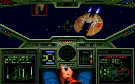 Once in the cockpit, the camera is locked onto your character’s head and you see the action through his eyes. Each fighter has a unique cockpit layout and the information you need is displayed on the monitors and gauges therein. You can even use the F keys to look left, right, and back to track targets through the canopy. Part of my terror at this game is that, when my father would die, the game cuts to a reverse shot of the player character throwing his hands up in front of his face as the cockpit bursts into white light, then shows the exterior of the ship exploding. It’s jarring and sickening and, when accompanied by my father’s jump in terror, was very affecting as a young man. Once I convinced dad to let me grip our black and red Gravis joystick, I found I was a natural and quickly outpaced his progress. (We’re pretty sure he never beat the first mission which, to be fair, features a flight through an asteroid field that is still a pain the ass.) A later iteration of the series, Armada, featured an early multiplayer mode and I would jump into the hotseat for a few rounds to get Dad’s score up until his friends cried foul.