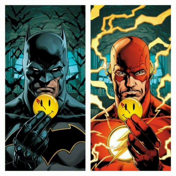 Still with me? Okay, here’s what’s happening at DC right now and why on newsstands you can buy an issue of Batman where he and the Flash are holding the Comedian’s famous button.
