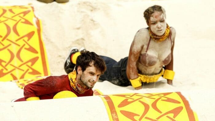 Now, onto lighter things. The three tribes will play what is essentially a Mario Party mini game in which they have to wriggle through the sand to get a ball over some mounds while their hands are tied. I cannot explain the childlike joy that radiates from me when I watch this challenge, but I laugh out loud practically the whole time I’m watching it. Especially watching Ryan go up, up, up, the ball nearly cresting the hill, only for it to roll back down, forcing him to chase after it on his belly. To top it all off, they are playing for a reward of several liters of iced coffee. Every time I see a reward for coffee on Survivor I have the same terrible thought: If I were to see a coffee reward one day, and a loved ones reward a different day, I would definitely cry more when I saw the coffee. If I were on the yellow tribe, I would have voted Ryan out just for that display. This challenge is also where Desi, who I am sad we haven’t seen more of because she seems to have a positive energy and a good game sense about her, really comes into her own as a challenge beast, which Jeff Probst even calls out later at the immunity challenge. I really hope we get to see Desi go beast mode on some individual immunity challenges, but hope Jeff’s praise won’t stick in the atmosphere and cause people to view her as a huge threat. Desi’s blue tribe ends up winning it all, with red tribe settling for a smaller jug of coffee.