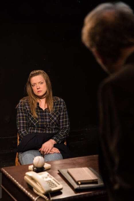 Carol (Gordon), a young student, seeks to address her failing grades and confusion with course concepts by visiting her professor John (McGowan). McGowan’s strong abilities permit his character to morph eerily between thoughtful/caring and pompous/arrogant, regardless of how fine the line is. Yet, I often found myself anticipating when the stakes would be heightened given that the dialogue feels very repetitive. While we want to believe John is as eager to help his student succeed as he says he is, it feels as plausible that his intentions may not be what they seem.