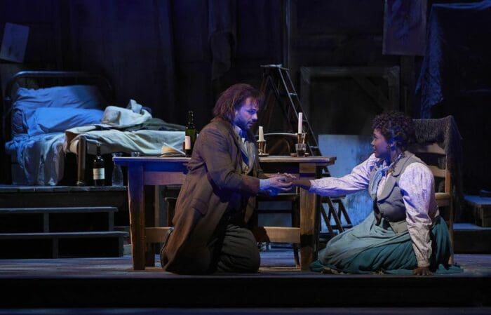 Being a huge fan of Jonathan Larson’s Broadway musical Rent, loosely based on the opera, I was particularly excited to dive into some of its source material. In both shows several artistic friends, down on their luck, occupy a studio together. Written and set a century earlier, in the 1890s, there are no filmmakers in Giacomo Puccini’s tragedy, libretto by Giuseppe Giacosa and Luigi Illica. Writer Rodolfo (Atalla Ayab) woos us with his romantic charm and artistic passion. But ultimately its Mimí (Angel Blue) who he seduces, a seamstress who shows up at the flat in need of a light for her candle (reminding us of Larson’s “Light my Candle”). Blue together with Ayab exude some of the strongest romantic chemistry I have seen on stage. Another noteworthy performance is the playful and vibrant Musetta (Andriana Chuchman) who resounds even when singing quietly. She is appropriately costumed (David Farley) in a bright pink dress as she practices restraint for her ex Marcello (Lucas Meachem) with futility, despite knowing – like Mimí – that the patronage of a rich lover can make life much less difficult.