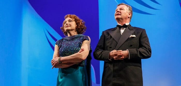 For this farce to work rather than fall flat, the leads must nail the comedic delivery while sustaining a necessary personal chemistry. Geraint Wynn Davies and Lucy Peacock comfortably clear that bar. Davies’ Elyot commands the stage, bloviating his way into our hearts; Peacock’s Amanda is a complex tour de force. Crucially, this pairing is far more than the sum of its parts. Their dynamic is captivating and convincing – we can see why Elyot and Amanda are inevitably drawn back together even as they infuriate each other. When the play lulls a little, as it does in the second half, it’s when the focus shifts to Sibyl and Victor. This owes more to the parts than the cast – Sophia Walker’s Sibyl stands her ground well while Mike Shara’s Victor is the right blend of stiff and bepuzzled – but neither can raise the roles above the “lightly wooden ninepins” envisaged by Coward.