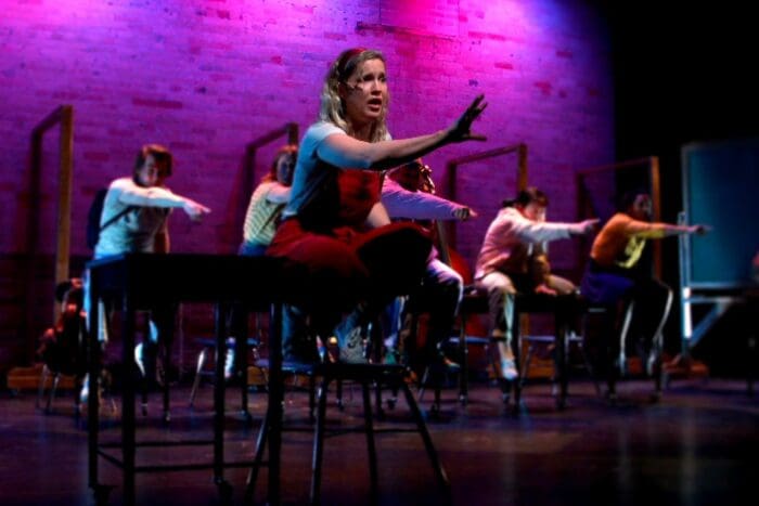 This naturalism of sorts is reflected in the minimalist set design and staging. The bright colours and landscapes of most fantasies are replaced by a black box whose dim lighting creates a different aura of mystery – with the chess motif providing nice visual contrasts. Basic wooden frames and blocks that could easily belong in Alice’s ‘real’ classroom carve up the stage and keep the focus where the action is.