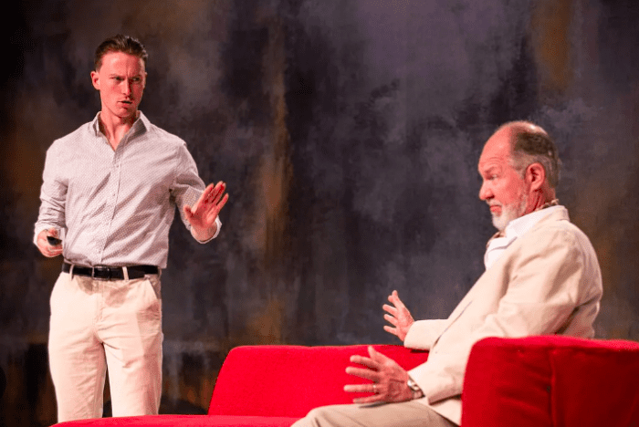 The rest of the production is strong in less crucial ways. Teresa Przybylski’s stylish set has a cleverly critical total lack of character and is revealed with tightly executed theatricality in an opening transition that sees a mass of black nothingness transform into a polished hotel lounge in the blink of an eye. Rachel Cairns is an inspired choice for the tricky role of Shannon, her omnipresent gravitas and intelligence not only strengthening that supporting role but also second hand lending a little credibility to LaVercombe’s Lee. The always great Diego Matamoros plays outgoing CEO Bill with evocative exhaustion and an accompanying over-willingness to compromise. Mumbi Tindyebwa Otu’s direction is naturalistic but deliberate, using the utility of the set design to create a few impactful visual metaphors but never wavering too far from the play’s foundational starkness. Lisa Karen Cox’s intimacy direction stands out for its honesty and blurriness in a very complicated and well-played drunk scene.
